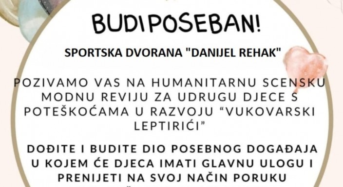 Rotary klub Vukovar 1231 ima čast pozvati vas na humanitarnu scensku akciju djece s poteškoćama u razvoju pod nazivom "Budi svoj! Budi poseban!". Kao i prošle godine, akciju organiziramo zajedno s Udrugom roditelja djece s poteškoćama u razvoju "Vukovarski leptirići". Ova akcija ima za cilj prikupiti sredstva i pružiti potporu radu Udruge kao i podići svijest o potrebama djece s poteškoćama u razvoju u našoj zajednici.