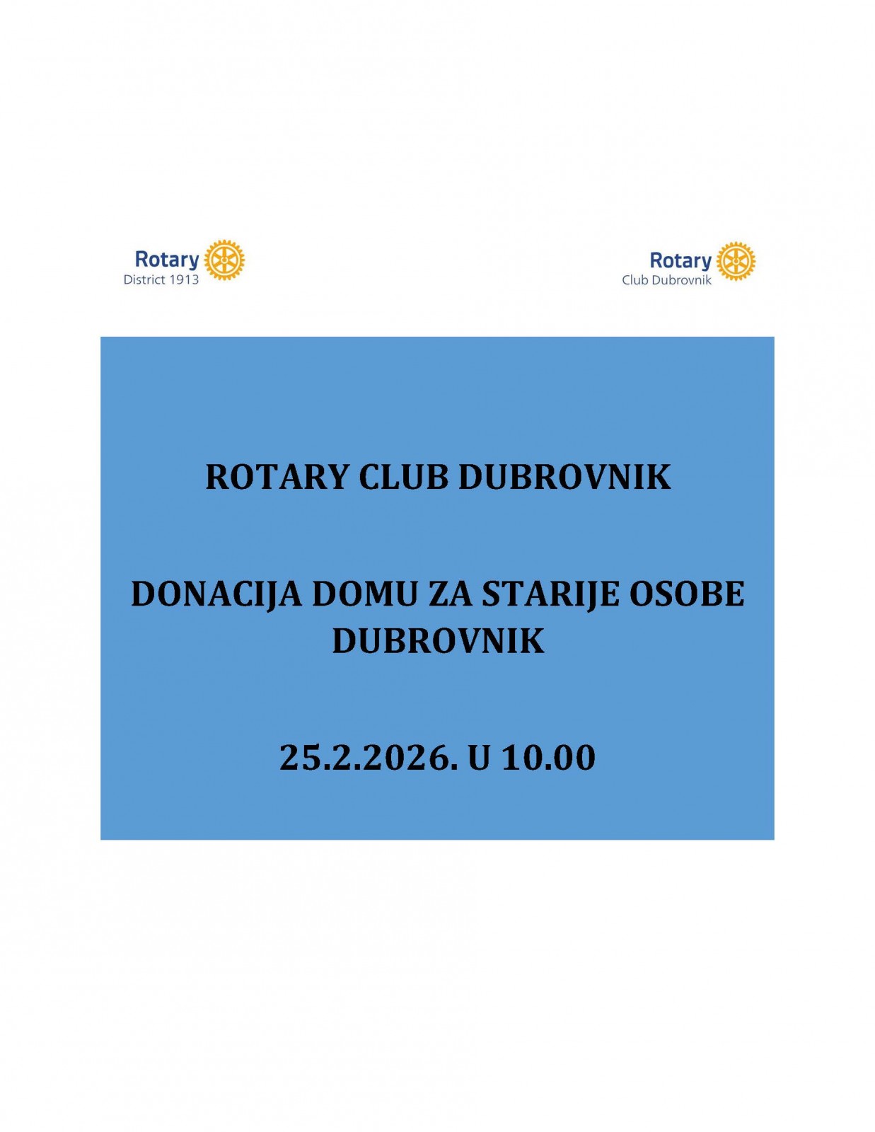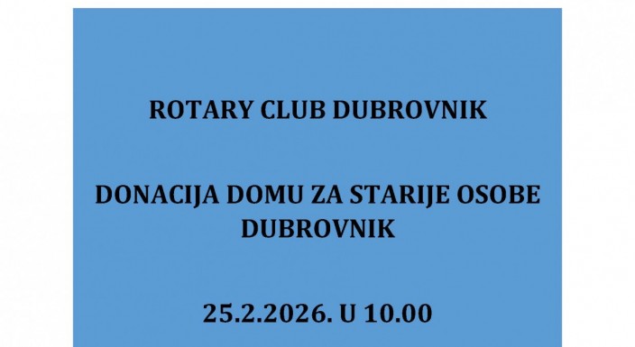 Rotary club Dubrovnik donira opremu za društvene aktivnosti s naglaskom na mentalno zdravlje i kognitivne sposobnosti te poticanje zajedničkih druženja korisnika Doma za starije osobe Dubrovnik. Primopredaja donacije održat će se 25.2.2026. u prostoru Doma za starije osobe Dubrovnik. Rotary club Dubrovnik ovom akcijom pomaže Domu za starije osobe u opremanju prostora za društvene aktivnosti njihovih korisnika čime poboljšava uvjete boravka i kvalitetu života u prostorima Doma.