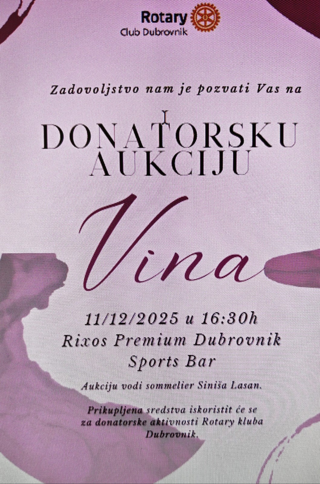 HrvatskaPozivamo Vas na donatorsku aukciju vina koja će se održati 11.12.2025. u 16.30 u Rixos Premium Dubrovnik Sports Baru. Aukciju vodi sommelier Siniša Lasan. Prikupljena sredstva iskoristit će se za donatorske aktivnosti Rotary kluba Dubrovnik.
