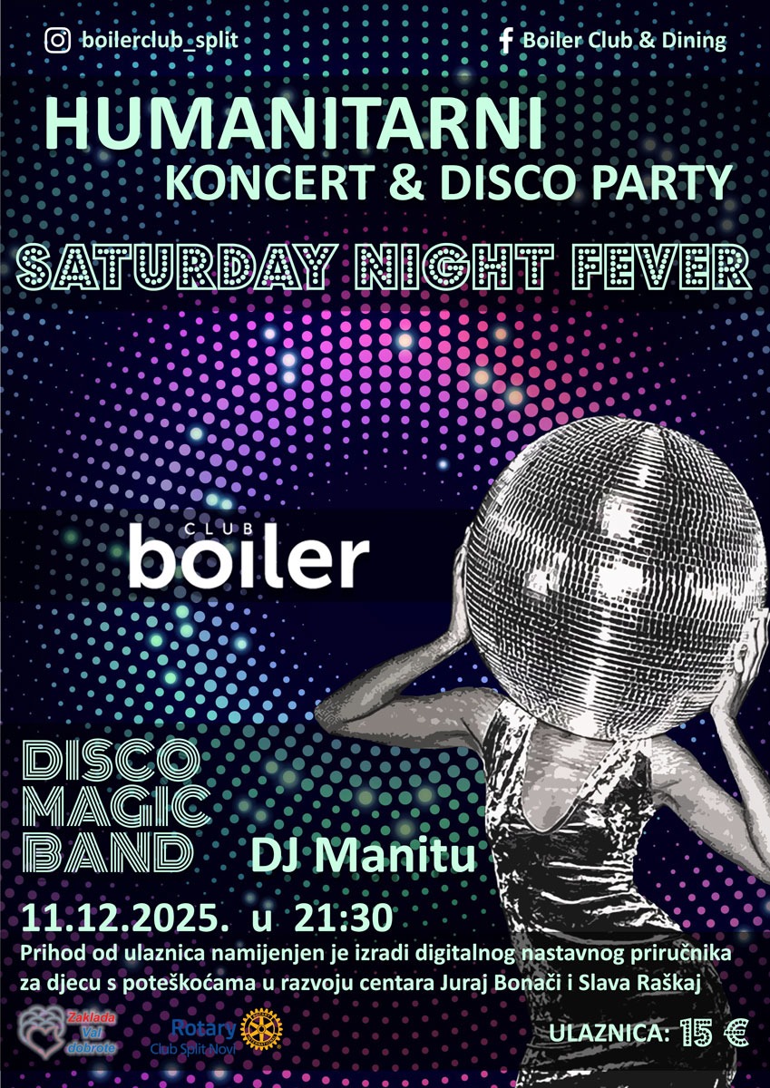Pozivamo Vas na humanitarnu glazbenu disco večer pod nazivom "Saturday Night Fever", koja će se održati u četvrtak , 11.prosinca 2025. u 21:30h u splitskom klubu Boiler.