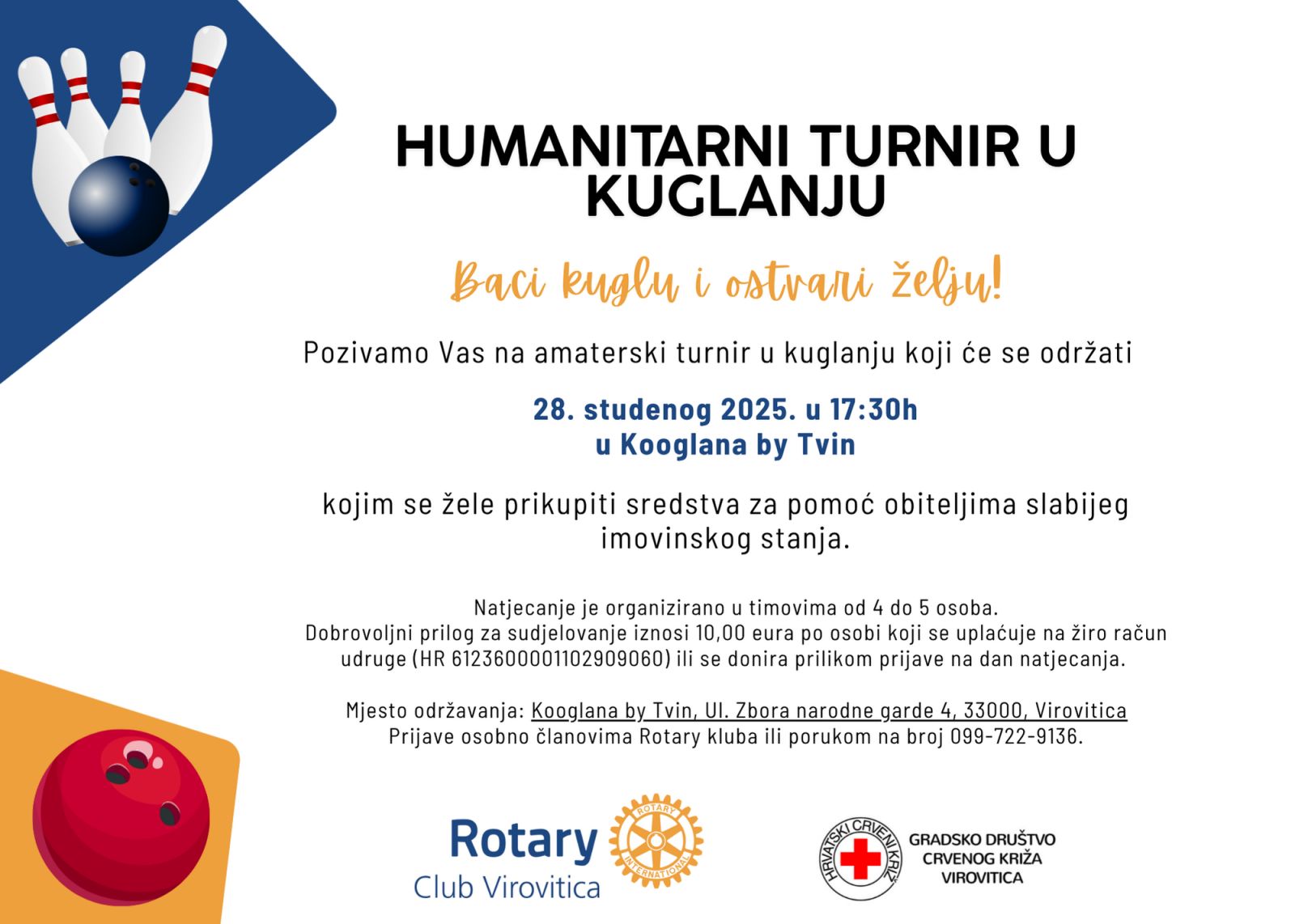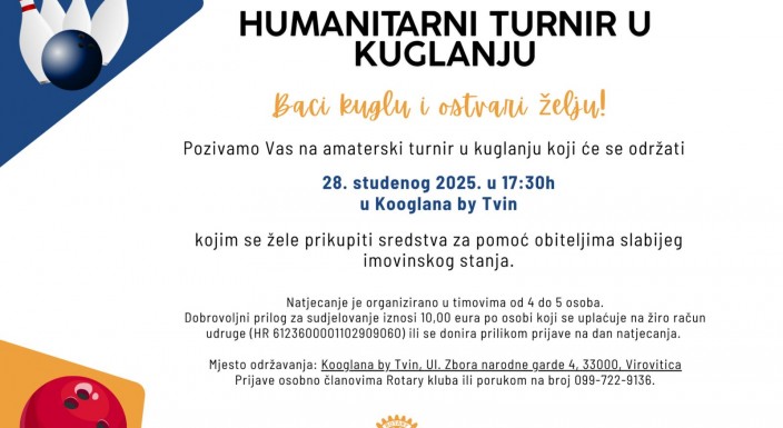 Pozivamo Vas na tradicionalni amaterski turnir u kuglanju koji će se održati 28. studenog 2025. u 17:30h u Kooglana by Tvin kojim se žele prikupiti sredstva za pomoć obiteljima slabijeg imovinskog stanja. Baci kuglu i ostvari želju!
