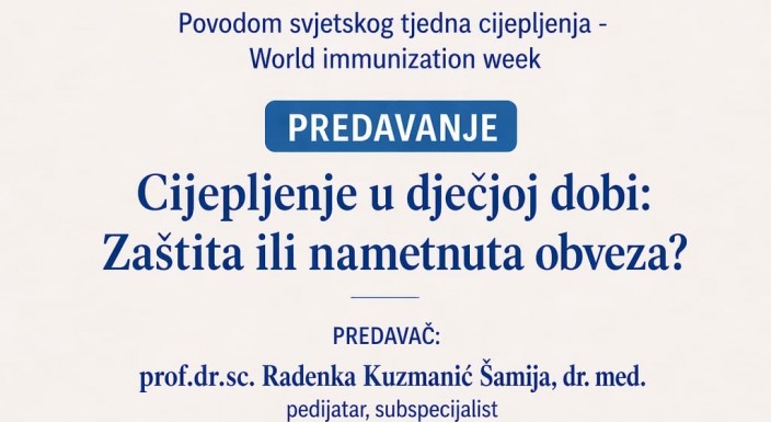 HrvatskaPovodom svjetskog tjedna cijepljenja - World immunization week pozivamo vas na predavanje : CIJEPLJENJE U DJEČJOJ DOBI: ZAŠTITA ILI NAMETNUTA OBVEZA?