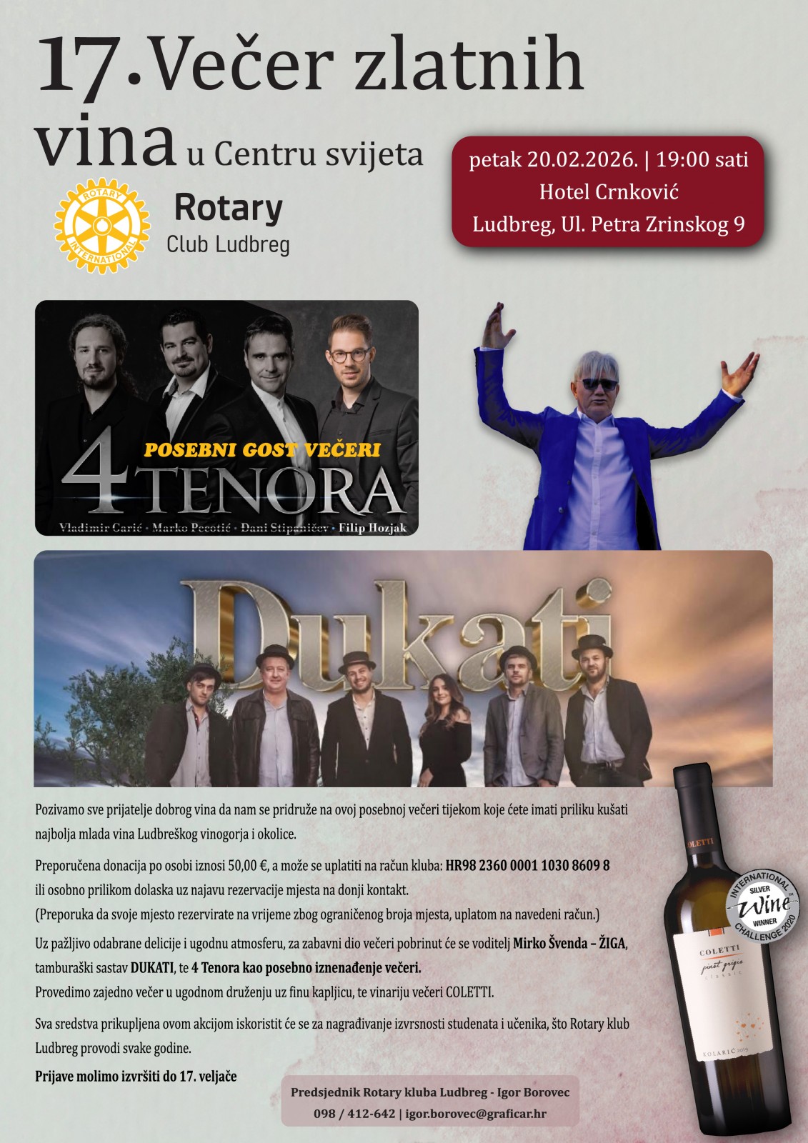 Rotary klub Ludbreg organizira tradicionalnu VEČER ZLATNIH VINA u “Centru svijeta“